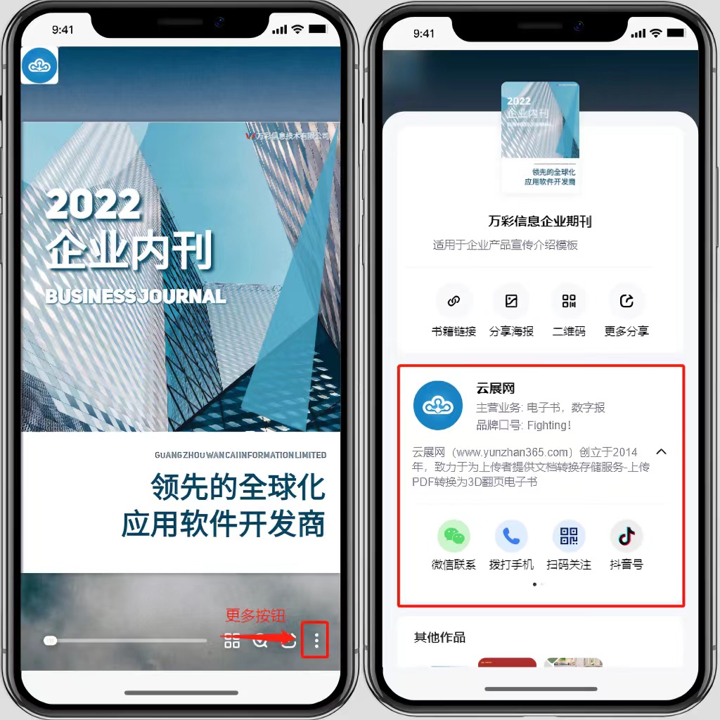 點(diǎn)擊電子畫(huà)冊(cè)的【更多按鈕】彈出品牌信息以及聯(lián)系方式