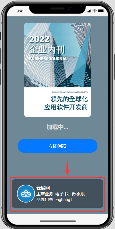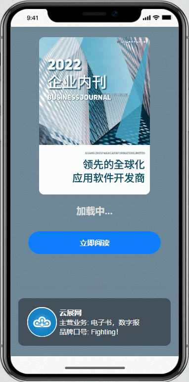 在電子畫(huà)冊(cè)的加載頁(yè)正下方顯示Logo、品牌名稱、主營(yíng)業(yè)務(wù)、品牌口號(hào)這四個(gè)信息,讀者點(diǎn)擊后,可彈出聯(lián)系方式