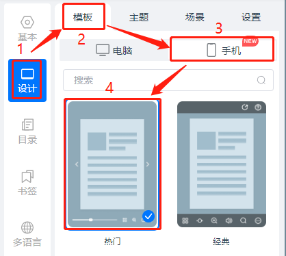 點(diǎn)擊【設(shè)計(jì)】,再點(diǎn)擊【模板】,最后點(diǎn)擊【手機(jī)】,選擇【熱門(mén)】模板
