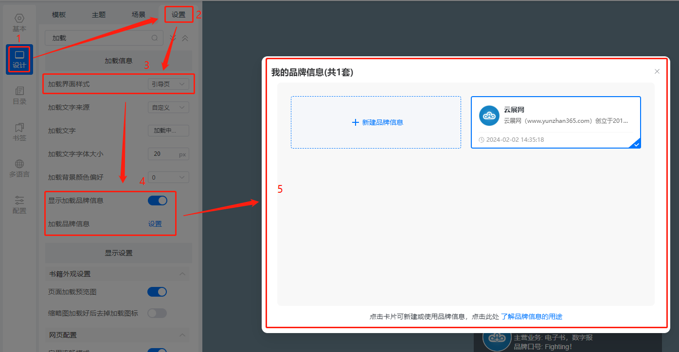 點(diǎn)擊【設(shè)計(jì)】,再點(diǎn)擊【設(shè)置】,將【加載界面樣式】改為【引導(dǎo)頁(yè)】,然后打開(kāi)【顯示加載品牌信息】,最后選擇使用一個(gè)創(chuàng)建好的品牌信息