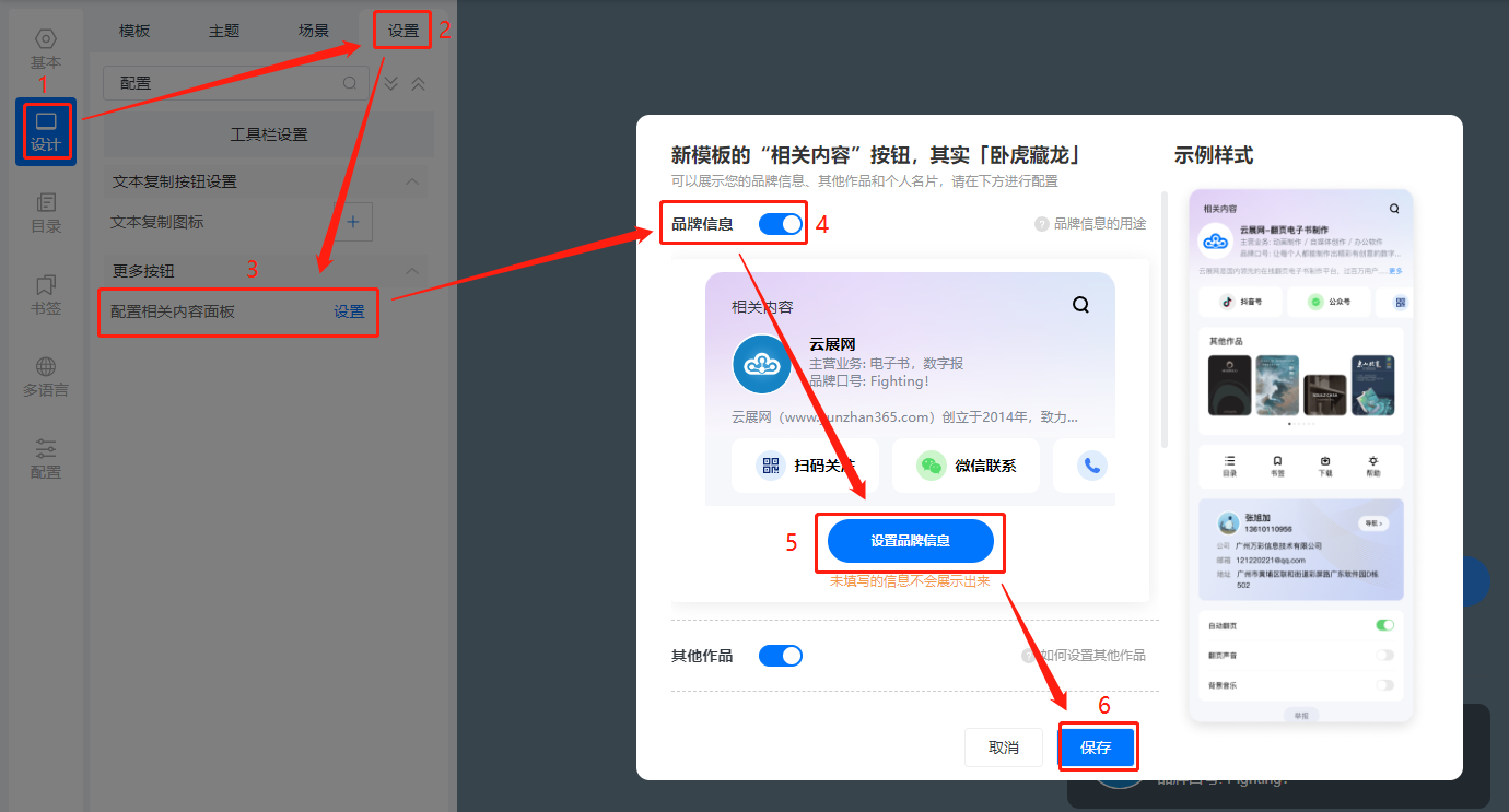點(diǎn)擊【設(shè)計(jì)】,點(diǎn)擊【設(shè)置】,設(shè)置【配置相關(guān)內(nèi)容面板】,打開(kāi)【品牌信息】,點(diǎn)擊【設(shè)置品牌信息】,選擇使用一個(gè)創(chuàng)建好的品牌信息,最后點(diǎn)【保存】