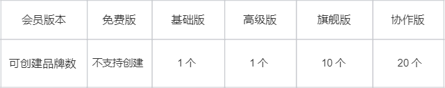 1)可創(chuàng)建品牌的數(shù)量跟據(jù)會(huì)員版本不同而不同,請(qǐng)看: