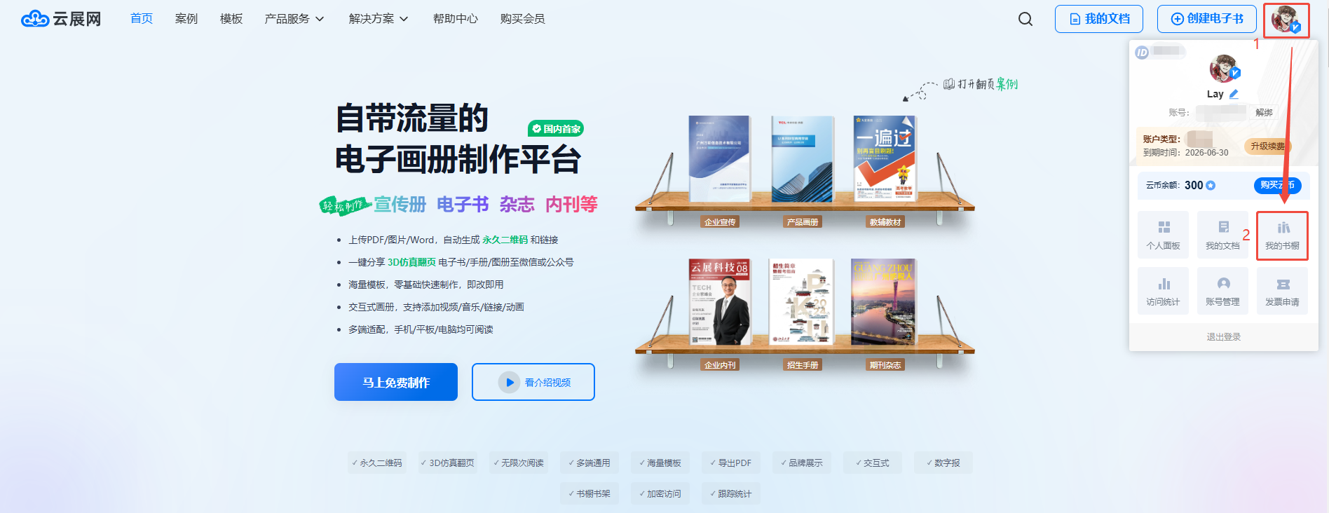 將鼠標懸停在云展網(wǎng)首頁右上角我的賬號上,點擊【我的書櫥】進入界面。