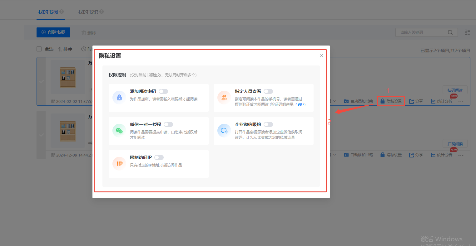 彈窗信息:就是讀者打開書本,彈出窗口顯示的文字信息。勾選提交姓名/提交電話/理由讓讀者填寫,方便您判斷這個讀者是否可以查看書本,授權(quán)提示可以寫一下聯(lián)系方式,用于提示讀者如何聯(lián)系您。