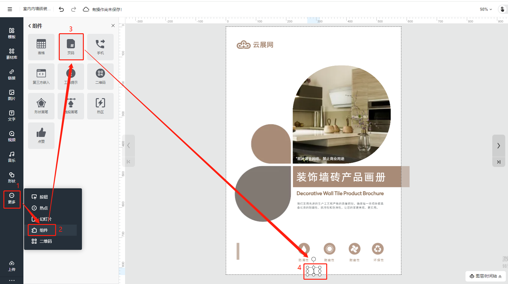 點擊【頁碼】,選擇【組件】,點擊【頁碼】,頁碼會自動按順序出現在所有的書本頁面上。