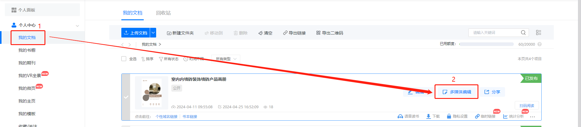 點進【我的文檔】/【文檔】,選擇對應電子書,點擊【多媒體編輯】/【內容編輯】。