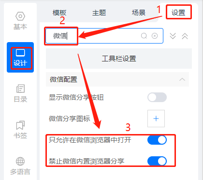 點擊【設(shè)計】,點擊【設(shè)置】,搜索框搜索【微信】,打開以下兩個配置