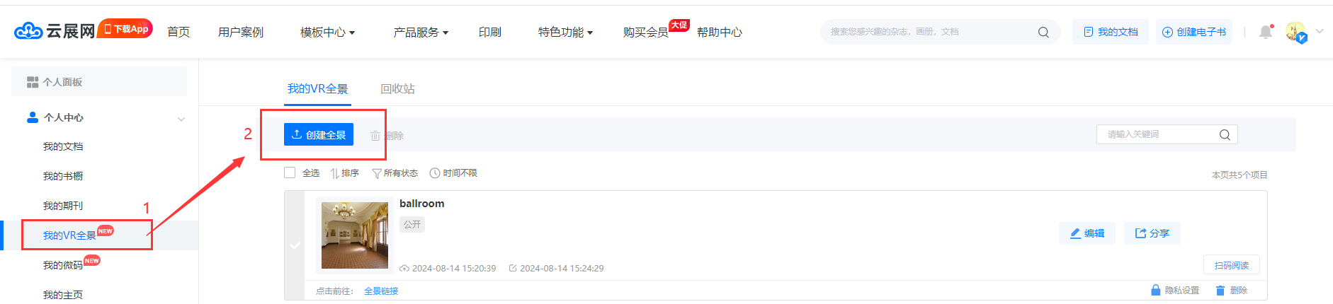 在【我的VR全景】頁面,點(diǎn)擊【創(chuàng)建全景】進(jìn)入編輯頁面