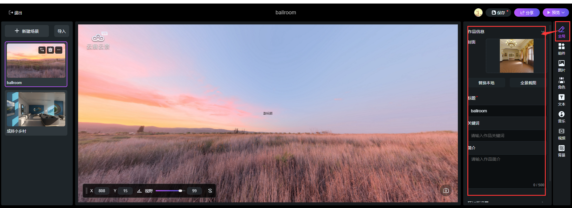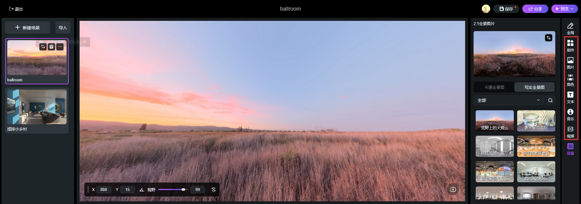 在頁面右側(cè)可設(shè)置組件、圖片、角色、文本、音樂、視頻等多種交互元素,滿足客戶的不同使用需求,同時(shí)可引導(dǎo)觀眾探索,增強(qiáng)故事敘述,使得虛擬體驗(yàn)更加生動(dòng)和有趣。