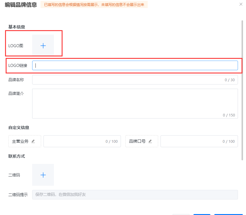 點擊【設(shè)置】,然后點擊【品牌設(shè)置】,創(chuàng)建品牌信息,并且只設(shè)置Logo圖和Logo鏈接,鏈接可以為空