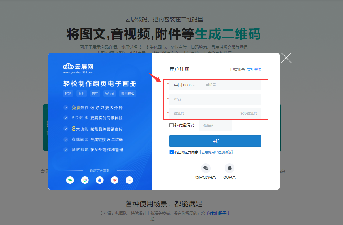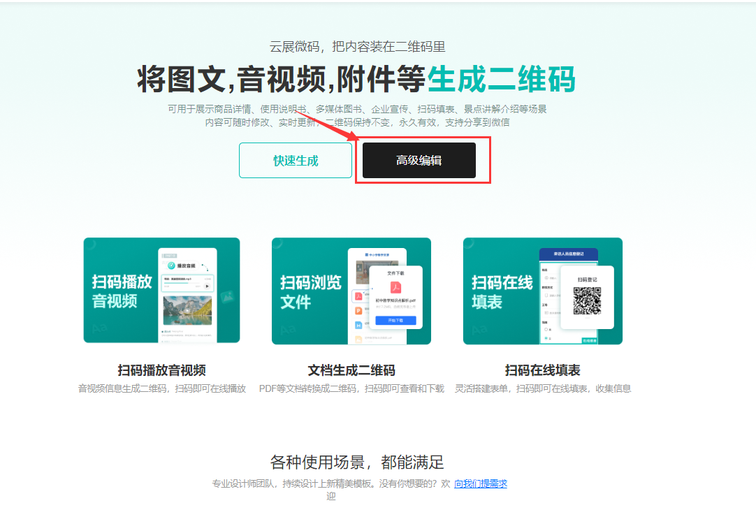 打開(kāi)云展微碼鏈接,點(diǎn)擊【高級(jí)編輯】,輸入手機(jī)號(hào)和密碼注冊(cè)后并登錄。