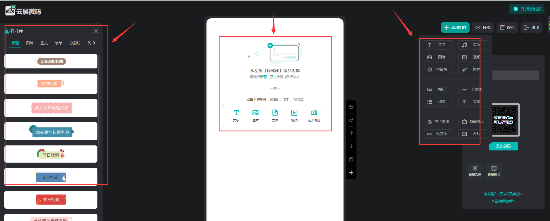 4、進(jìn)入編輯器頁(yè)面,在頁(yè)面上添加圖文、音視頻、附件,設(shè)置樣式等內(nèi)容