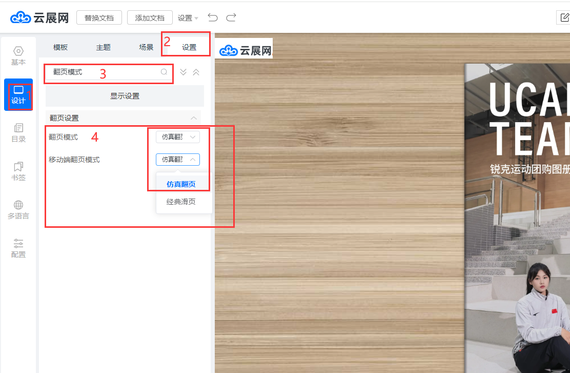 ①點擊【設計】,點擊【設置】,輸入“翻頁模式”關鍵字查詢,選擇仿真翻頁