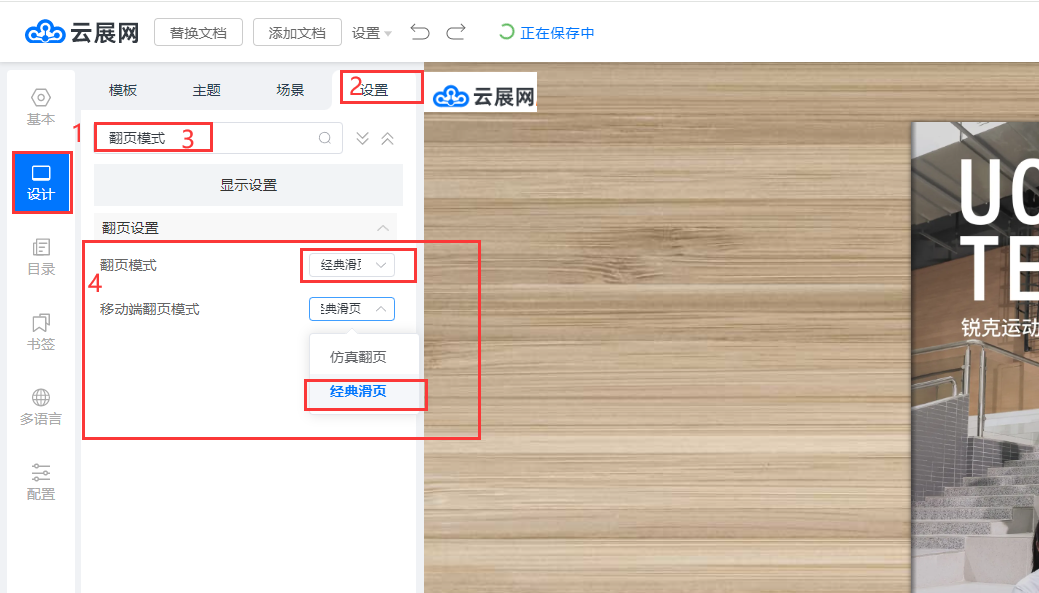 ①點擊【設計】,點擊【設置】,輸入“翻頁模式”關鍵字查詢,選擇經典滑頁