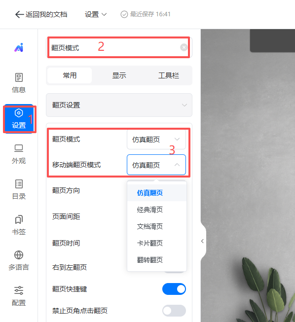 ①點擊【設置】,輸入“翻頁模式”關鍵字查詢,選擇仿真翻頁