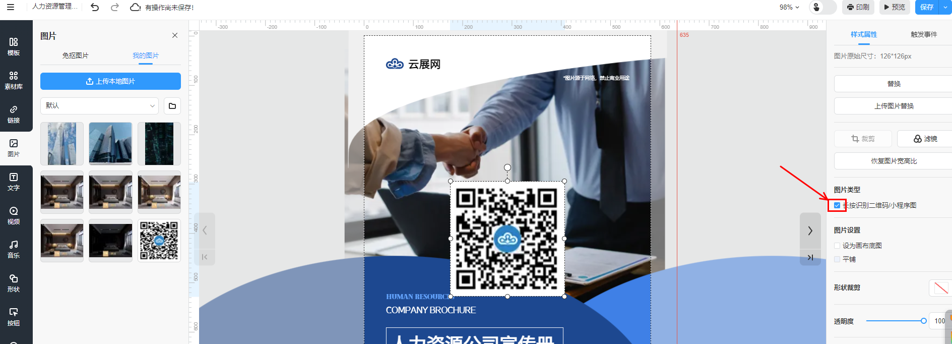 在多媒體編輯的時候添加二維碼/小程序圖片,并勾選可識別按鈕,那么讀者在閱讀您的書本時,就可以“長按識別”打開您書本頁面上的二維碼或小程序了。