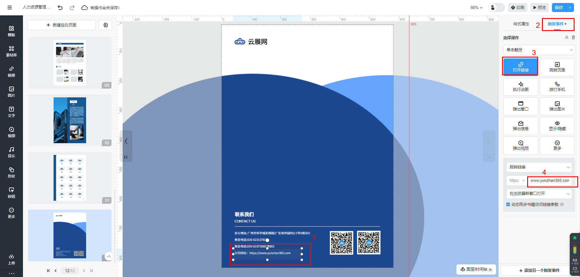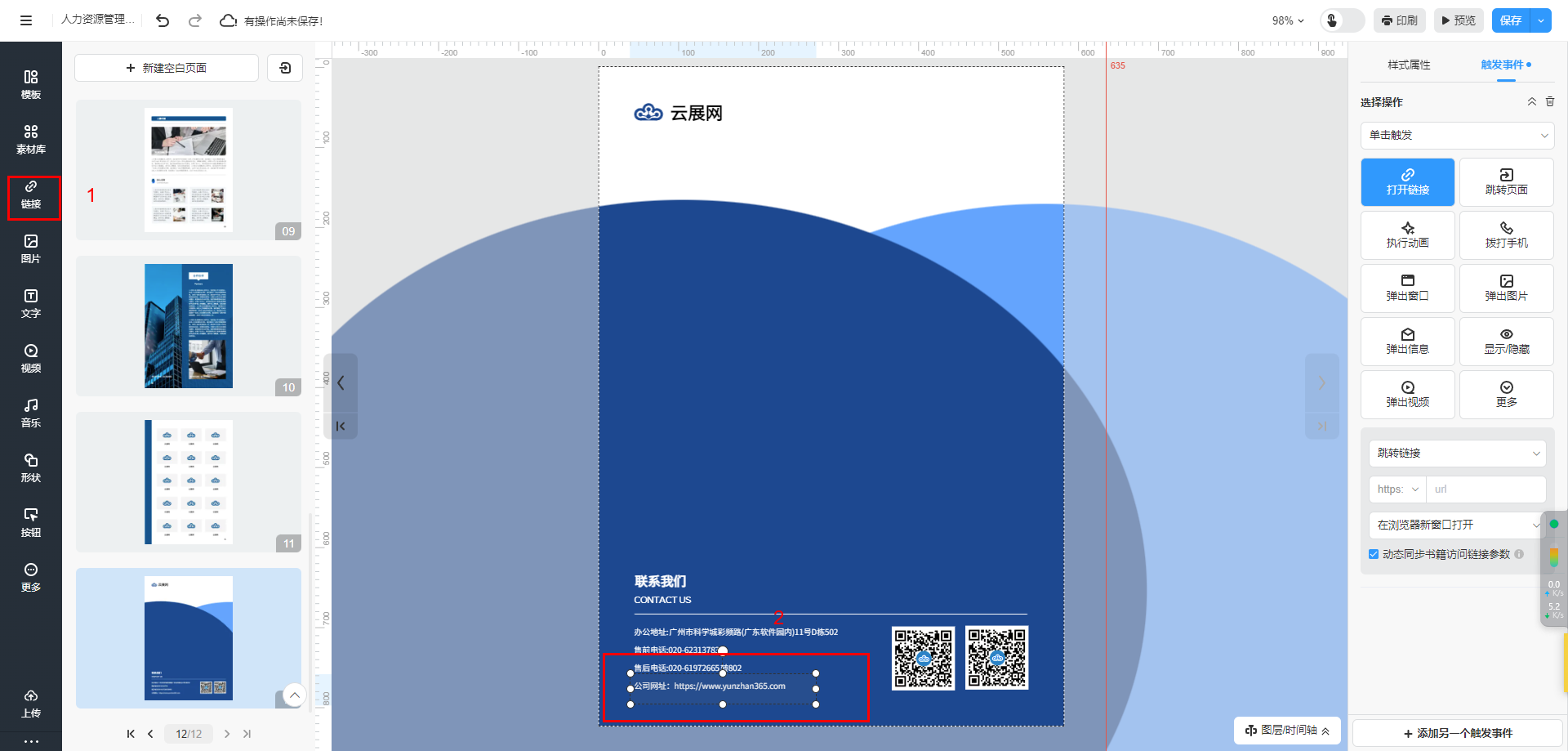 (2)在右邊設(shè)置面板,點(diǎn)擊【觸發(fā)事件】,選擇【打開鏈接】動(dòng)作并且輸入跳轉(zhuǎn)鏈接。