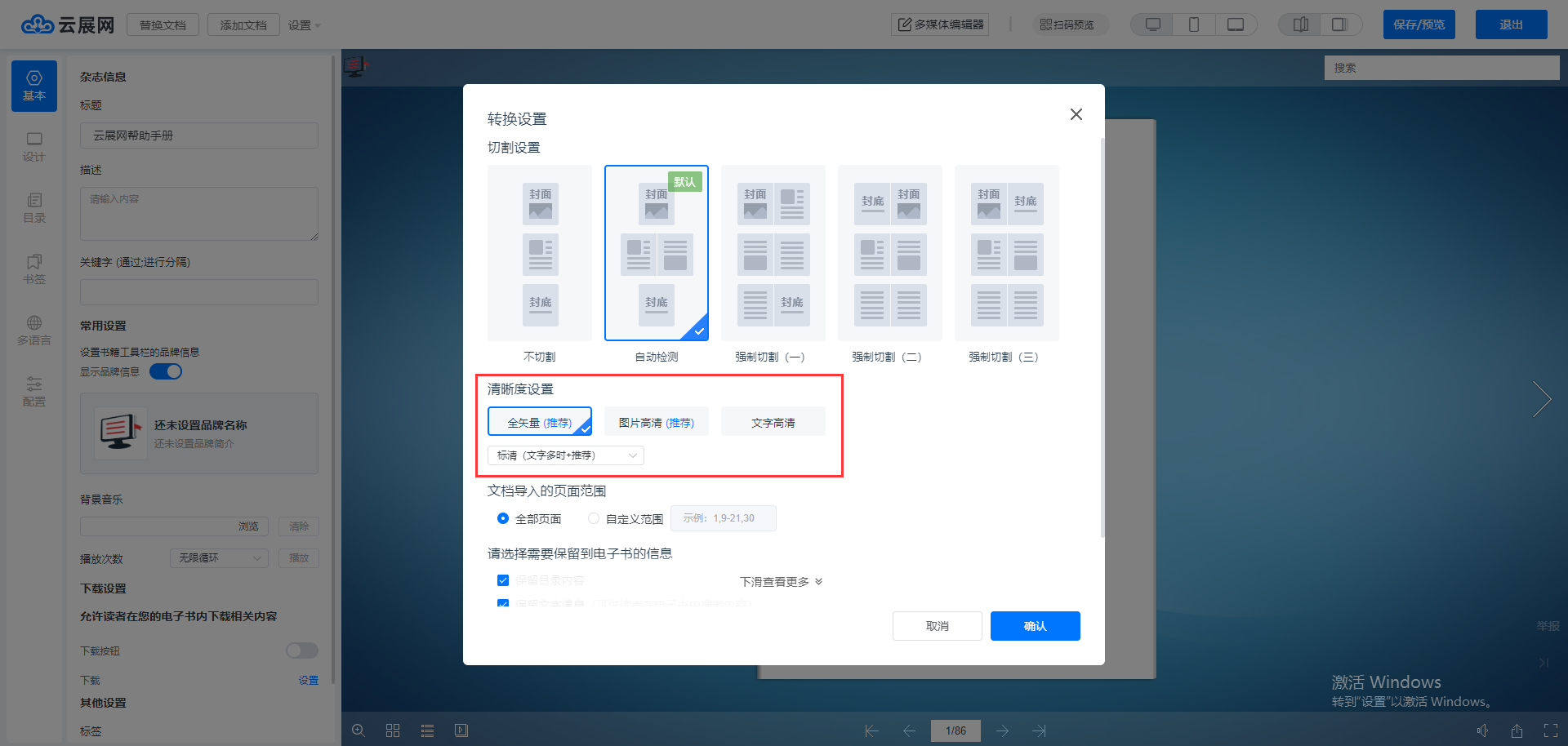 如果文檔本身清晰,但是在云展網上傳轉換以后模糊的話,可以設置如下三個選項來進行調節: