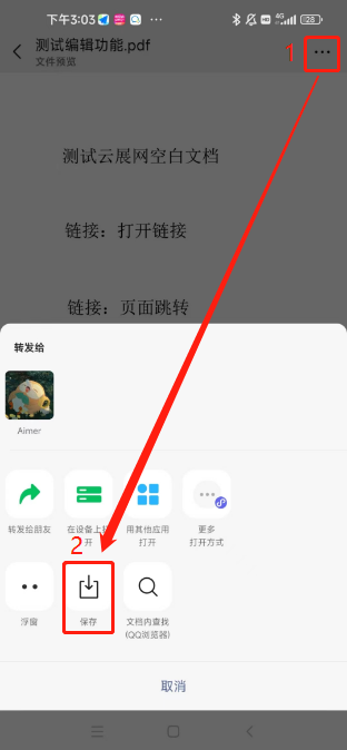 先將文件發到微信上并打開,點擊右上角三個點,點擊【保存】,文件便會保存到手機相應的路徑上。